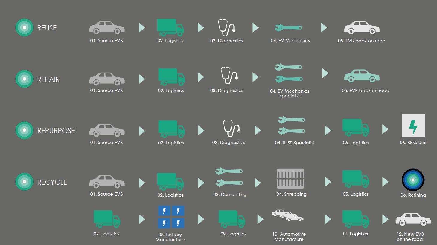 • Recycling – Businesses that will break the battery down, through a series of processes, to extract the minerals/metals for recycling to make new EVBs.